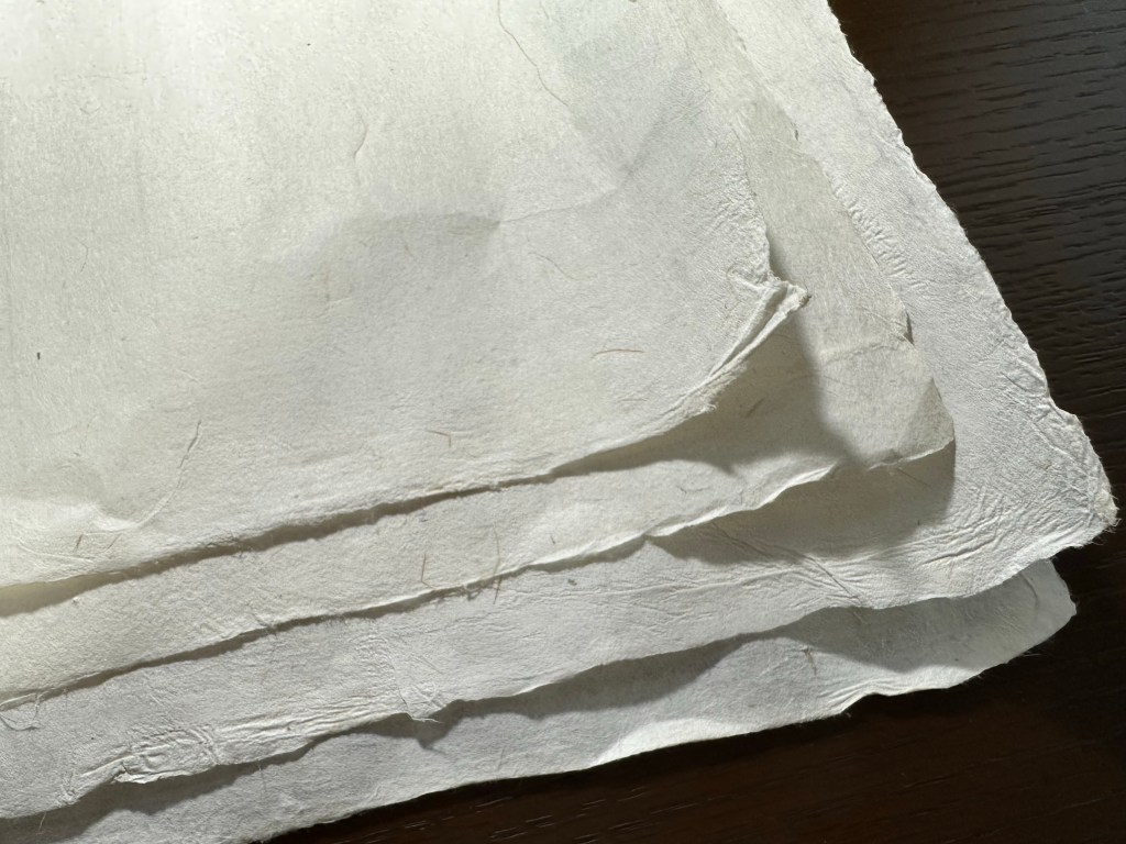 月桃紙を丁寧に貼り合わせ、胡粉と膠を使用して制作しています。月桃紙からできている張り子です。